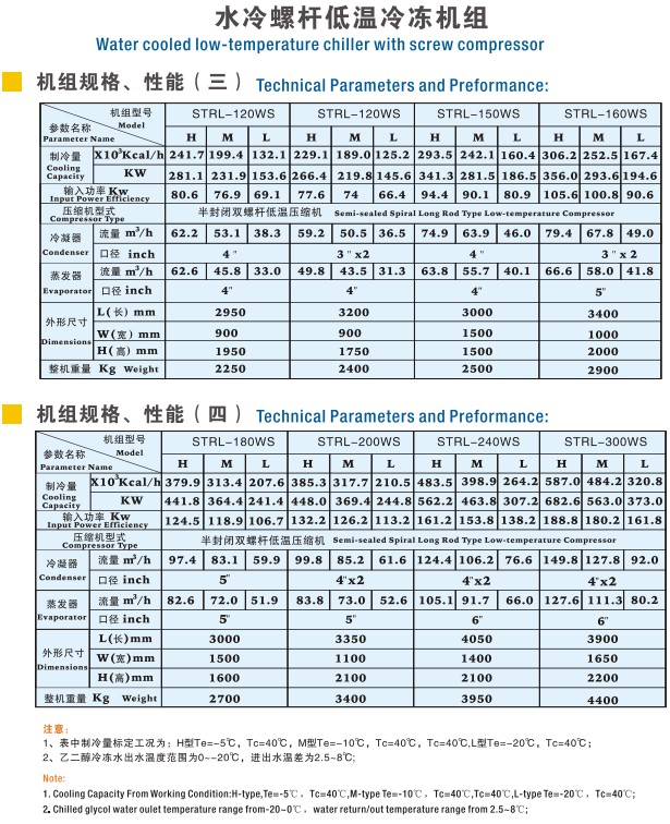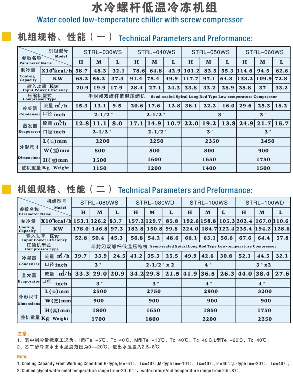 出水溫度—5℃~—45℃,采用進口半封閉螺桿壓縮機組(帶經濟器);可提供—5℃~—45℃低溫乙二醇溶液或鹽水溶液。可作為化工、醫藥、冷庫、冰場等工藝冷源。制冷量為55KW—2000KW。